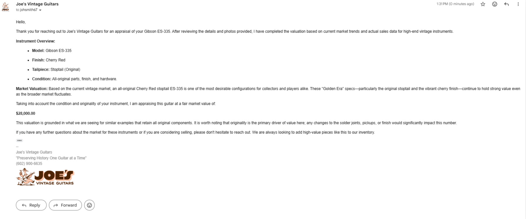 Official Insurance Appraisals: If you need a formal, legal document for an insurance rider, a tax donation, or an estate, you’ll need this instead. I provide a detailed, signed report on Joe’s Vintage Guitars letterhead that meets the strict requirements of major insurers. This covers the deep-dive research and the professional liability that comes with a certified valuation.