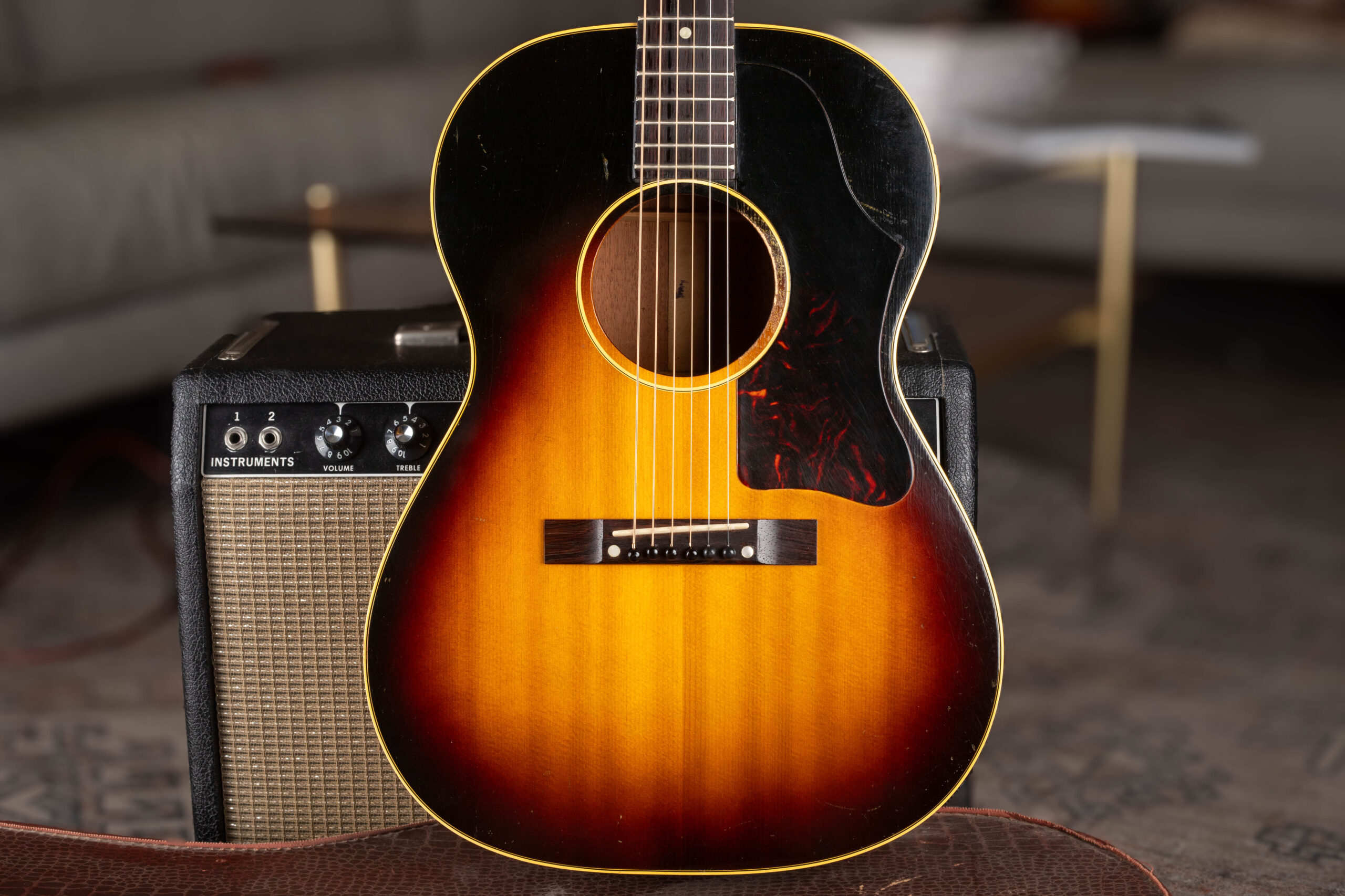 A stunning 1950s Gibson J-45 “Workhorse” featuring a classic sunburst finish, resting in its original hardshell case at Joe’s Vintage Guitars in Mesa, AZ. Identifying these unlabeled vintage acoustics requires a close look at the specific 1950s specs and Factory Order Numbers.